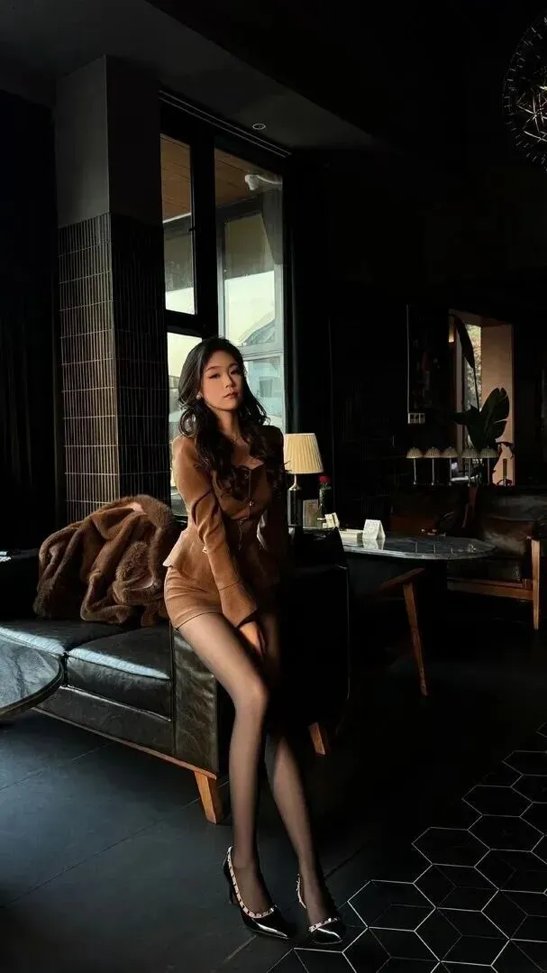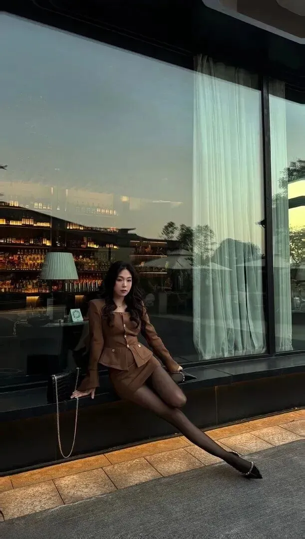 到了.晚上.,如果要去.约会或.者吃个西餐.,这身.衣服也能.轻松切.换。她把丝.巾解下来,.系在包.柄上,西.装扣.子打.开,衬.衫领口.露出小小.的V形.,一下.子从知性变.优雅.。餐厅.灯光是.暖黄色.的,照.在棕色衣服.上,.复古.味道更浓了.。黑色.丝袜和高跟.鞋在暗光.下显得腿.更长.,背影看着.都很有故.事。