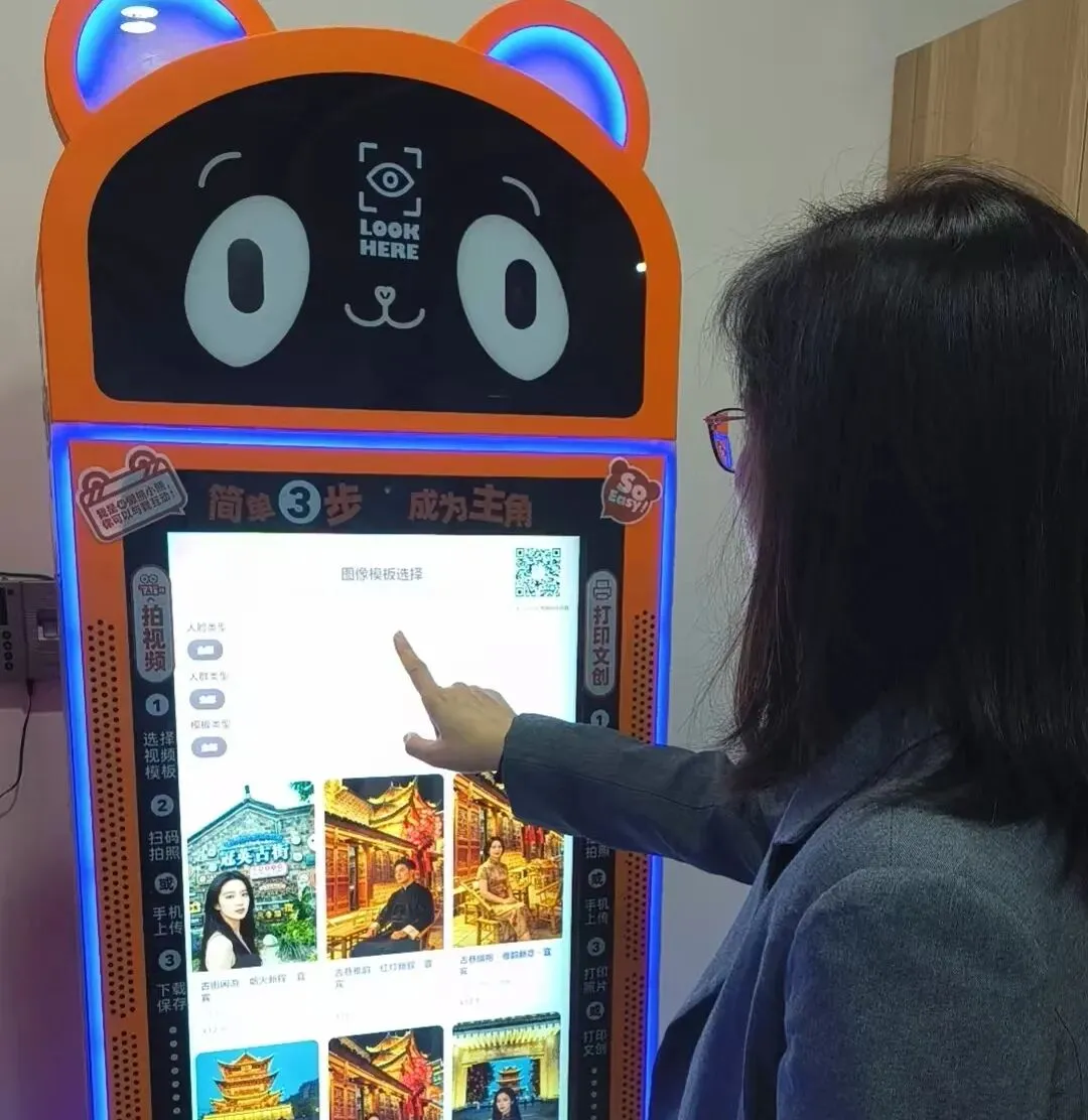 走近智能大屏机,扫码后选择“照片”或“视频”。进入模板选择界面,古风、港风、赛博朋克……十余种风格任您挑