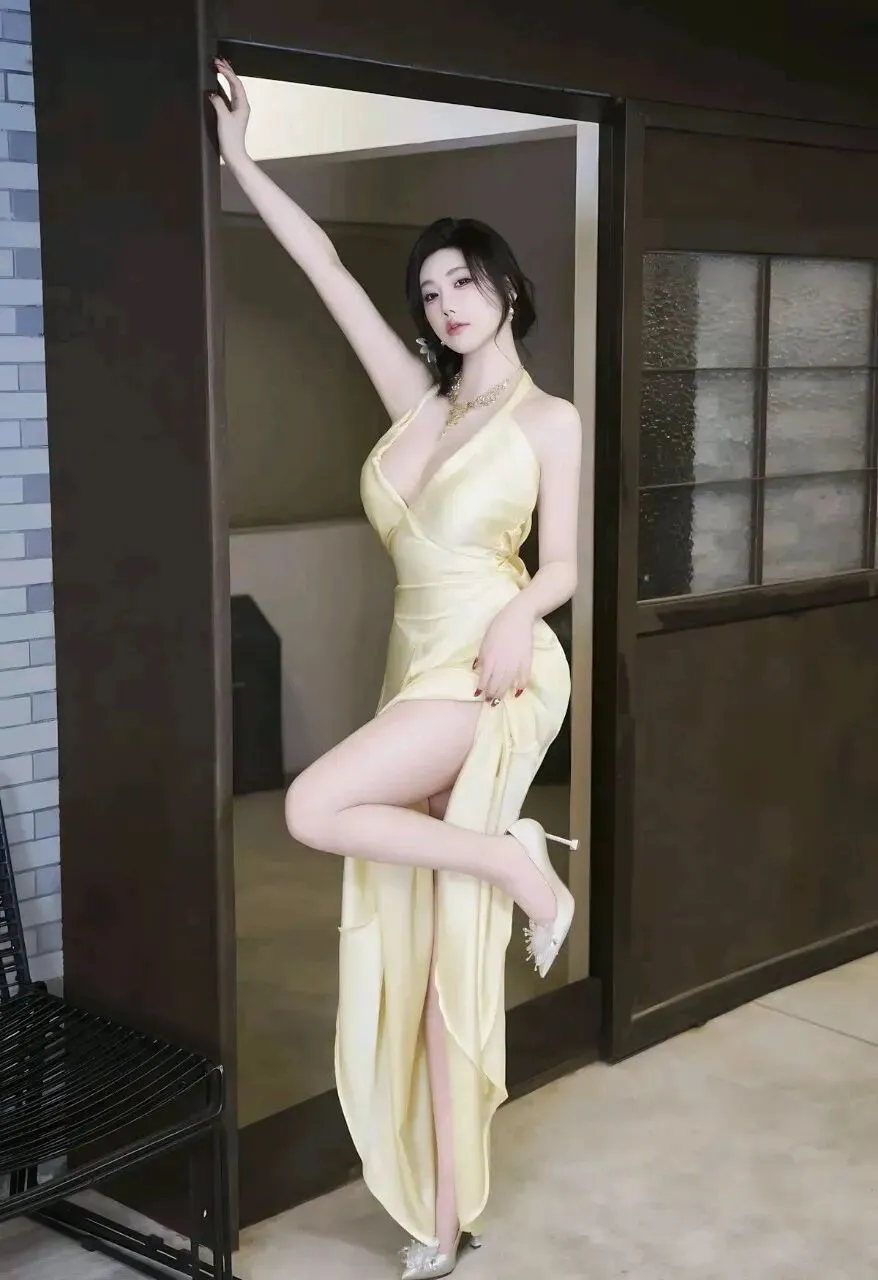 她在清吧的门口拍的那张,木质的门框和玻璃门很有质感,她一只手搭在门框上,另一只手轻轻撩起裙摆,一条腿微微抬起,身体微微侧着,眼睛直视镜头。这个角度能显得腿很长,而且鹅黄色的绸缎在暖黄的灯光下,显得格外有光泽,像流动的蜂蜜。风从门口吹过来,裙摆轻轻飘动,连带着她的头发也跟着晃了晃,这种不刻意的姿态,比任何精心摆拍的照片都更打动人。