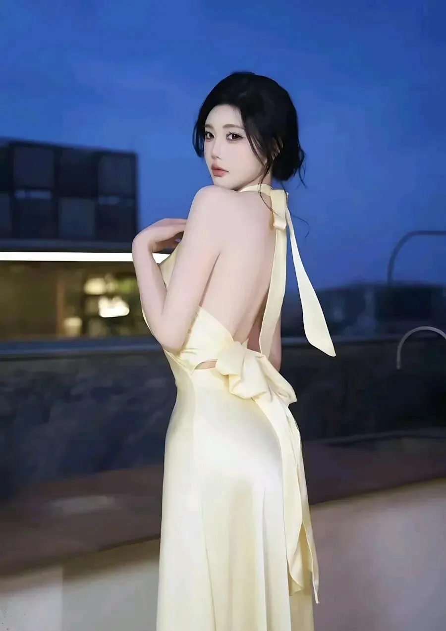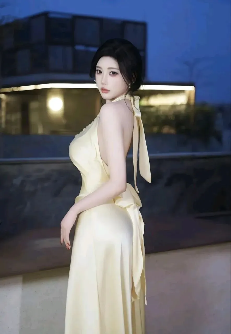 这条裙子很适合约会的氛围,同样也很出片,鹅黄色的绸缎面料,摸上去滑溜溜的,贴在身上像裹了一层月光。挂脖的设计刚好露出了肩颈线条,深V的领口又添了几分小性感,却不会显得刻意;背后的蝴蝶结绑带是点睛之笔,走路的时候会轻轻晃动,像一只振翅的蝴蝶;高开叉的裙摆从大腿处延伸下来,既能修饰腿型,又能在迈步时露出一截白皙的小腿,显得灵动又优雅。她搭配了一双同色系的细高跟,还有一条精致的锁骨链,整体造型温柔又不失气场,像从老电影里走出来的女主角。