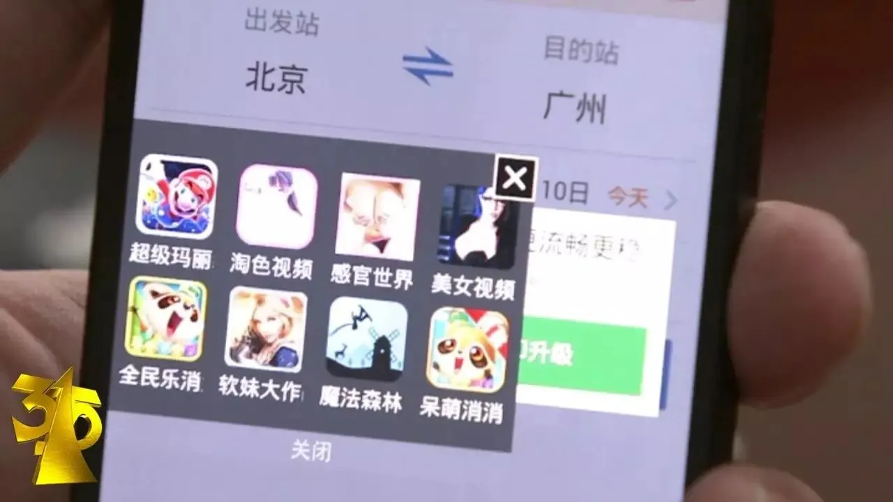 这是一款专门为抢购火车票而设计的应用程序,记者注意到,在使用这个软件的过程中,会弹出提示框,上面排列着一些与应用程序类似的图标,技术人员点击美女视频的图标,手机立即出现了一个安装界面。