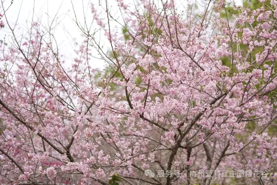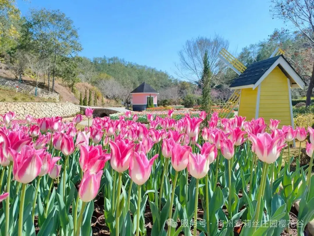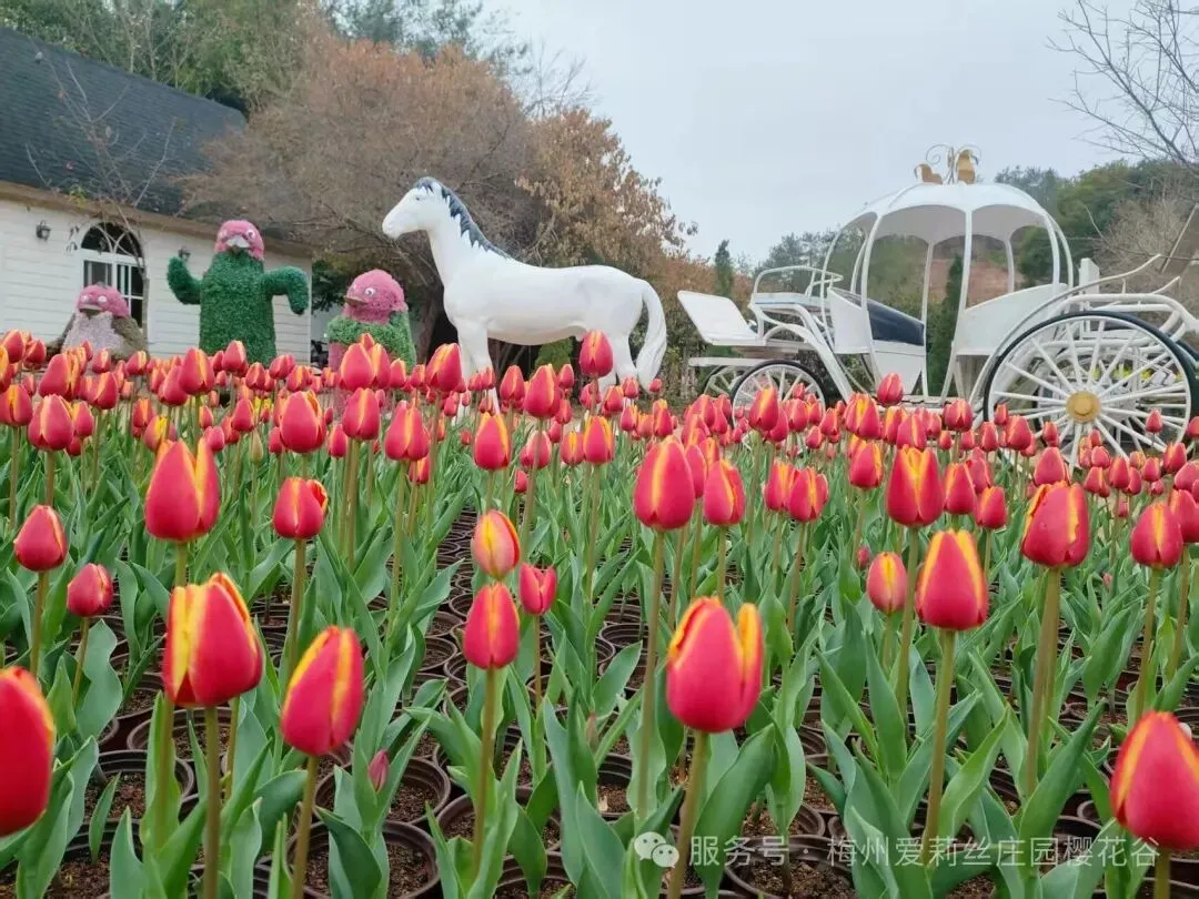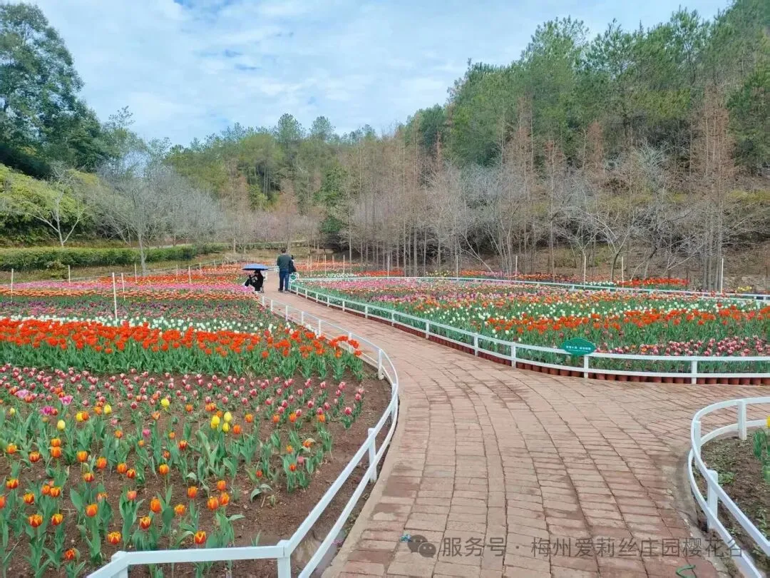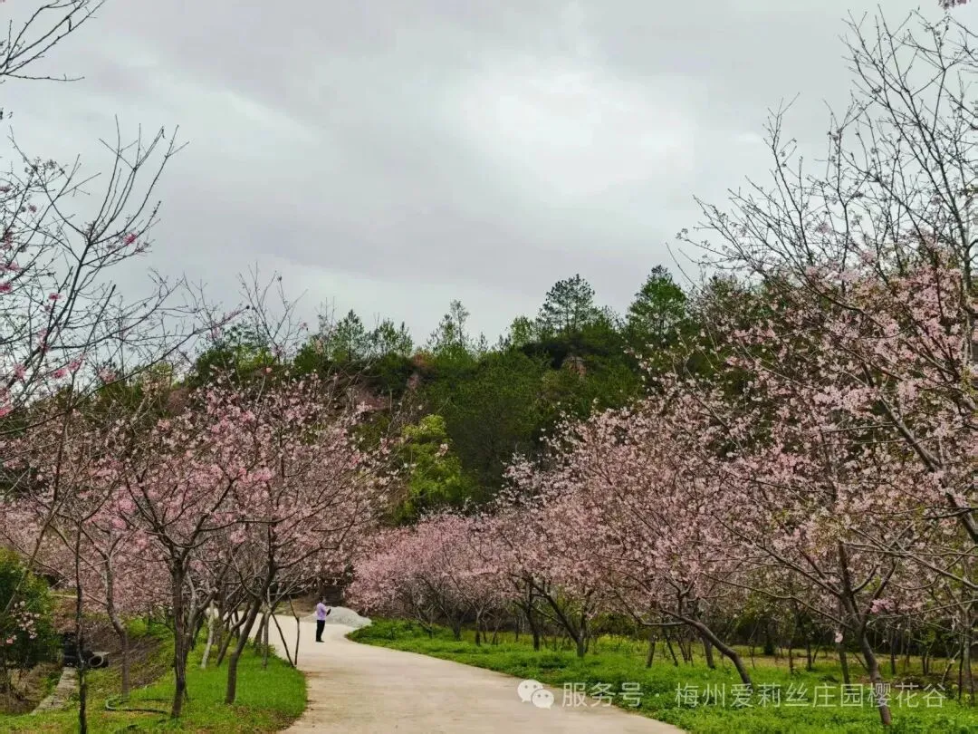 前往【爱丽丝庄园,赏樱花/郁金香花海】眼下正是樱花盛开的季节,走在樱花谷的林间小径上远远望去,就能够看到繁花满树一团团,一簇簇、如同一片片红霞。爱丽丝庄园是客家台商在梅州创业的一个缩影,爱丽丝庄园已进驻了广东梅州梅江台湾农民创业园,该台创园积极利用农业农村部海峡两岸农业交流合作项目、广东省农业厅粤台农业合作园区建设项目、广东省委组织部“扬帆计划”产业人才培育工程等政策,为爱丽丝庄园的发展提供支持,并且聘请农业专家每年为其提供多种农业技术指导。003年,樱花谷从台湾引进樱花,经试植、嫁接改良后,形成樱花景观并对外开放。园内定植绯寒樱、八重樱、香水樱、富士樱、吉野樱等多个樱花品种5000多株,花色绚丽多彩。(花期受天气等因素影响,届时以实际花况为准)