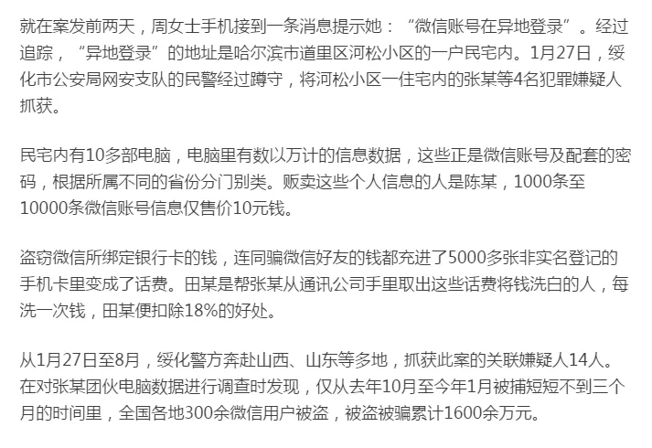在同一天,绥化市接到了10多个相同的报警电话,都是微信绑定的银行卡先被盗走了钱,随后微信群发消息骗自己微信好友帮忙存话费。绥化警方认定,与以往单纯的电信诈骗不同,这是一种新型的网络盗窃诈骗案件。