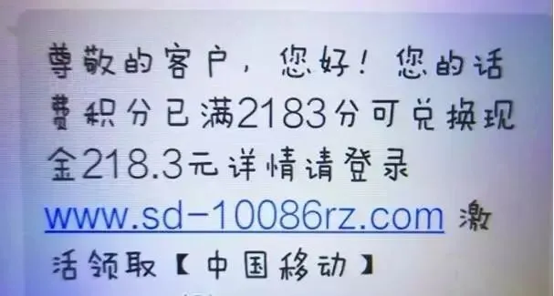 第一种是短信里的网页链接,比如“同学聚会的照片”、“你孩子的成绩单”、“你老公(妻子)的出轨照”、“积分兑换奖品”等;