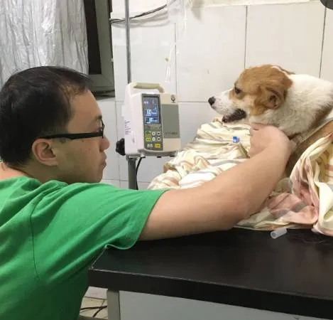 天天是我和老公一起养的狗,一次它得了结石,半夜三点钟做完手术,我们在动物医院里陪它打点滴。老公挠着它的脖子,希望能缓解它的疼痛和不安情绪。