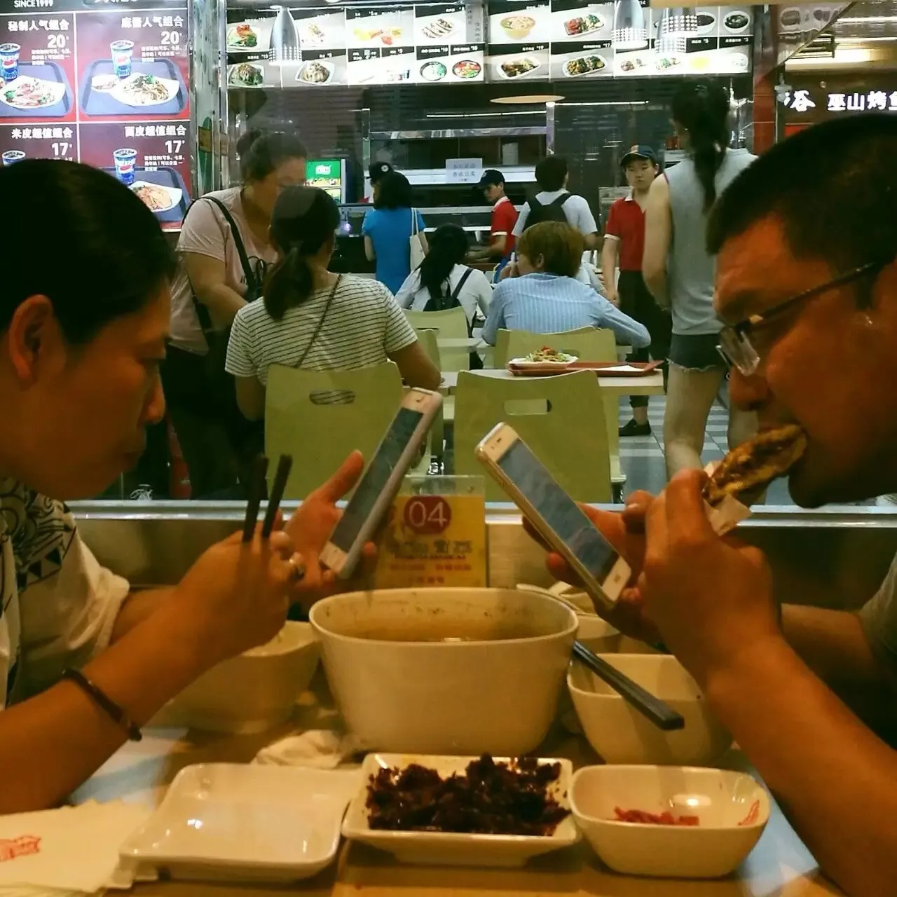 一对恋人吃冒菜,各拿一个手机投入玩耍,硕大的肾6plus挡住了彼此的脸。让我想起shall we talk的歌词:“情侣的晚餐,白开水一样淡,宁愿面对着一部电脑无事忙”。