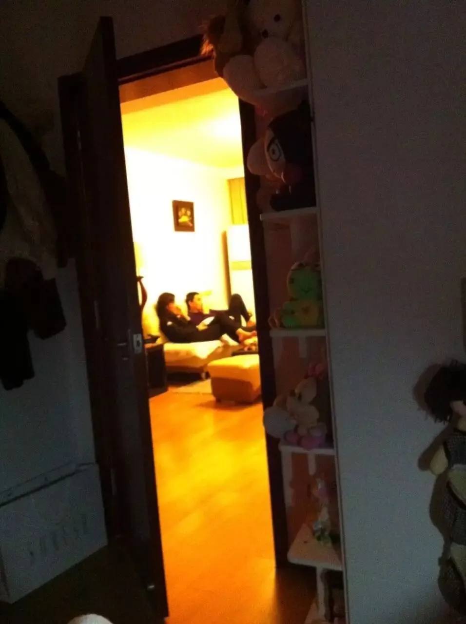 这是我大学第一年寒假准备回学校时拍的。当时,我在房间收拾返校的行李,心里有种还没离开家就开始想家的伤感,这时听到客厅里传来我爸我妈嘎嘎地笑声。两人都穿着秋裤,并排着坐在沙发上,脚还都蹬着茶几,一遍看电视一遍聊着天,给人一种完全松了一口气的感觉:闺女终于要滚回学校了……后来想想,也许这就是我理想中的爱情吧。