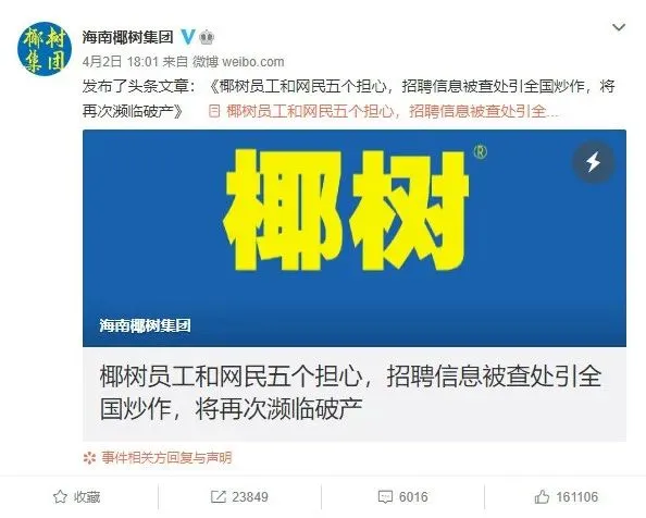 4月2日下午6时,这篇文章在椰树集团官方微博发布。截至4月3日晚20时,其阅读量高达593万次,转发量和点赞量分别达2.3万次和16.1万次。