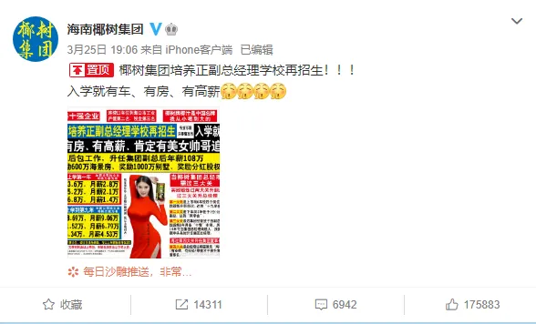 3月25日,椰树集团通过微博发布信息:椰树集团培养正副总经理学校再招生,入学就有车、有房、有高薪,肯定有帅哥美女追。