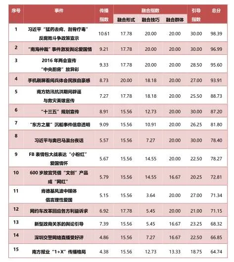 人民网舆情监测室梳理自2014年8月中央深改组提出媒体融合两年来重大事件和议题的新闻宣传,从事件传播广度、融合传播程度、舆论引导效果等三方面,总结出全媒体平台上最具有融合传播力的15个案例,在互联网“大众麦克风时代”为新闻宣传创新、媒介融合与产业发展提供新的思考角度。