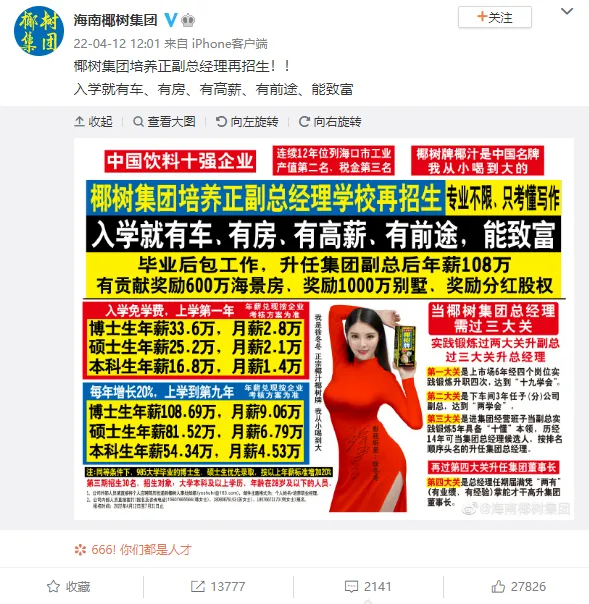 椰树集团发布招聘广告,