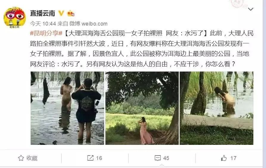 继2016年5月之后,短短两月,云南大理再曝裸拍事件——7月21日,云南当地资讯博主@直播云南 转发网友爆料称,在大理洱海海舌公园有女子在拍摄裸照。