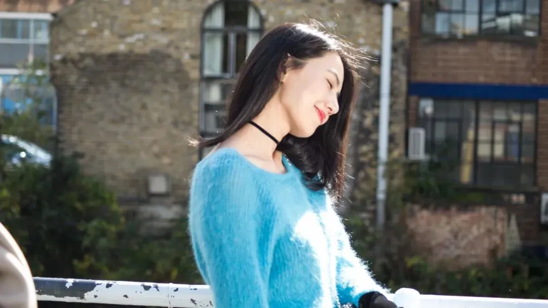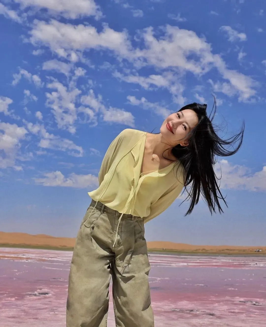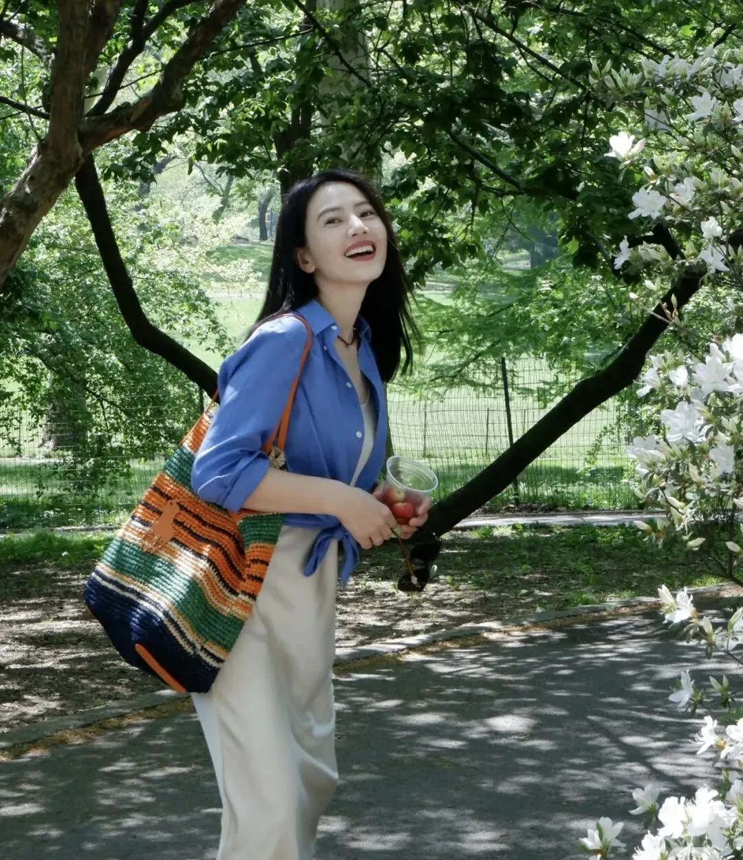 开扇型的双眼皮,眼角自然上扬,笑时甜美可亲,不笑时清澈中带着疏离。她的美不需要浓妆艳抹的加持,一件白衬衣、一条浅蓝色牛仔裤,就足够让人挪不开眼。