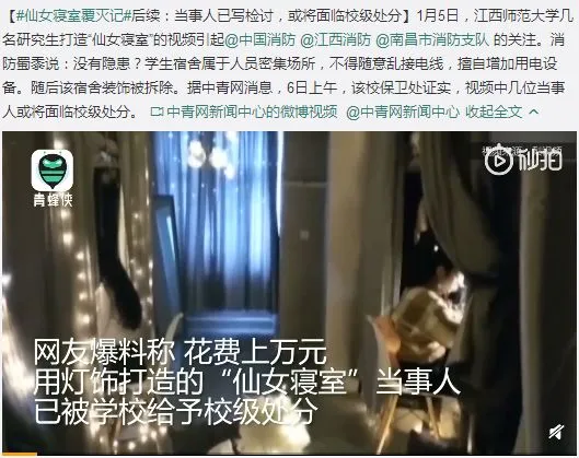 近日,一段“美女研究生打造仙女寝室”的视频热传,打造该寝室的学生确保“没有任何安全隐患”,5日晚,该行为被@中国消防 “点名拆除”,记者6日从该校保卫处证实,视频中几位当事人确实将面临校级处分