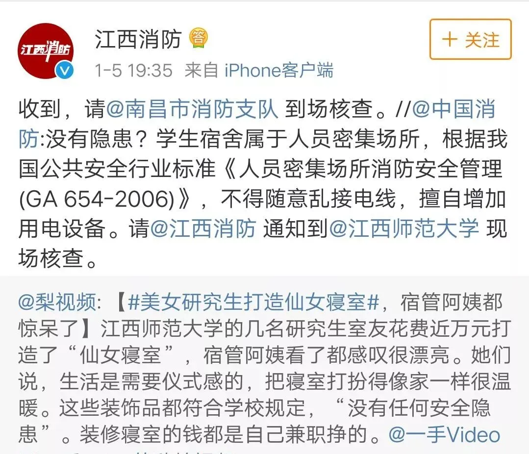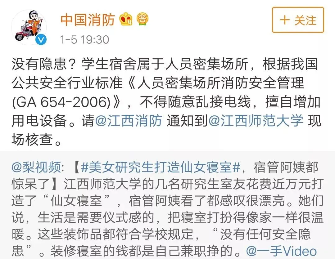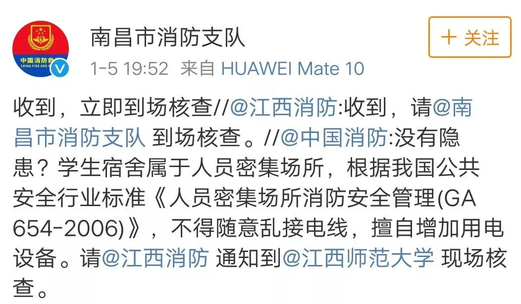原来,@中国消防 1月5日就发现并转载了这条微博,表示:学生宿舍属于人员密集场所,根据中国公共安全行业标准《人员密集场所消防安全管理(GA 654-2006)》,不得随意乱接电线,擅自增加用电设备。请@江西消防 通知到@江西师范大学 现场核查。