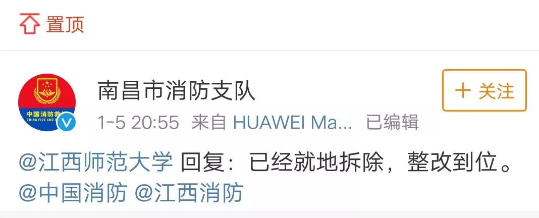 @南昌市消防支队 随后发微博表明,已就地拆除,整改到位。