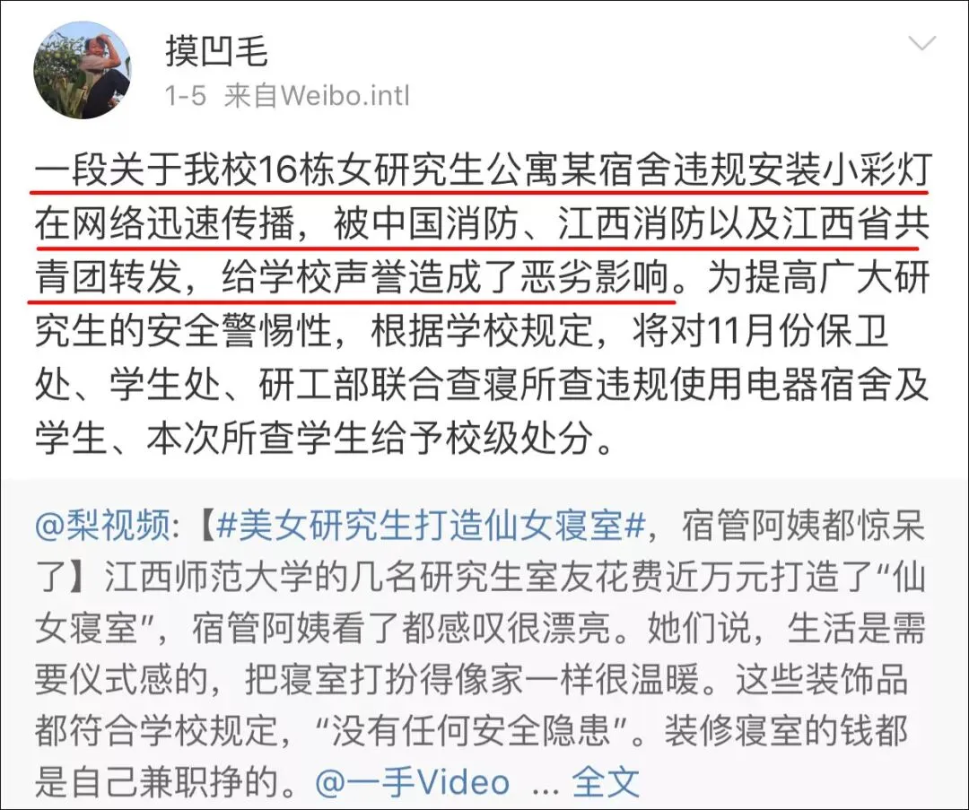 还有网友发文称学校的处罚理由与学校声誉受损有关,“一段关于我校16栋女研究生公寓某宿舍违规安装小彩灯在网络迅速传播,被中国消防、江西消防转发,给学校声誉造成了恶劣影响。”