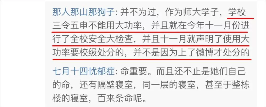 还有师范大学学子现身表示,学校三令五申不能使用大功率,早在11月就声明了相关行为会受到校级处分,“并不是因为上了微博才处分的”。