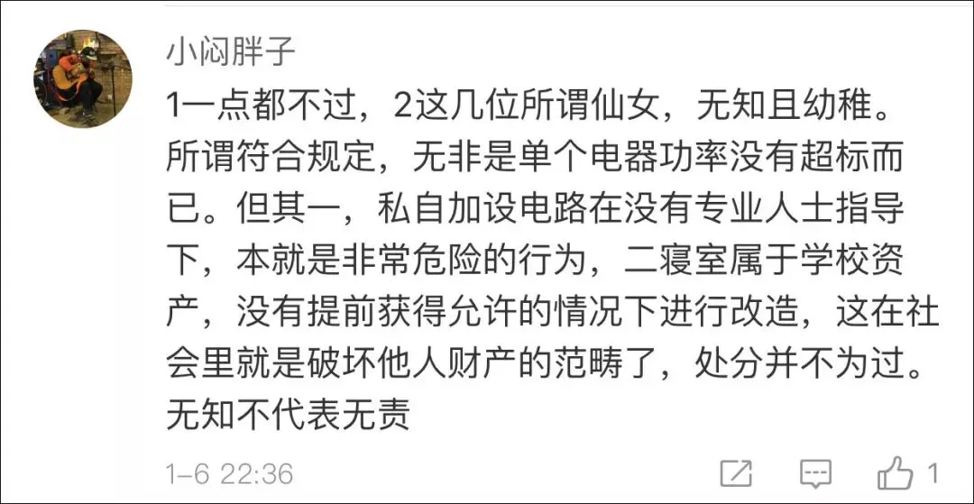 不过,对于部分网友认为处分太过分的说法也有其他网友给出了回应,“所谓符合规定,无非就是单个电器功率没有超标而已,可是私自加设电路,本来就是非常危险的行为”;