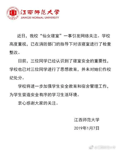 在“当事人或将面临校级处分”的消息传开后,江西师范大学7日对此事发布声明称:学校高度重视,已在消防部门的指导下对该寝室检查整改。学校已对三位同学进行了思想教育,并未对她们作校纪处分