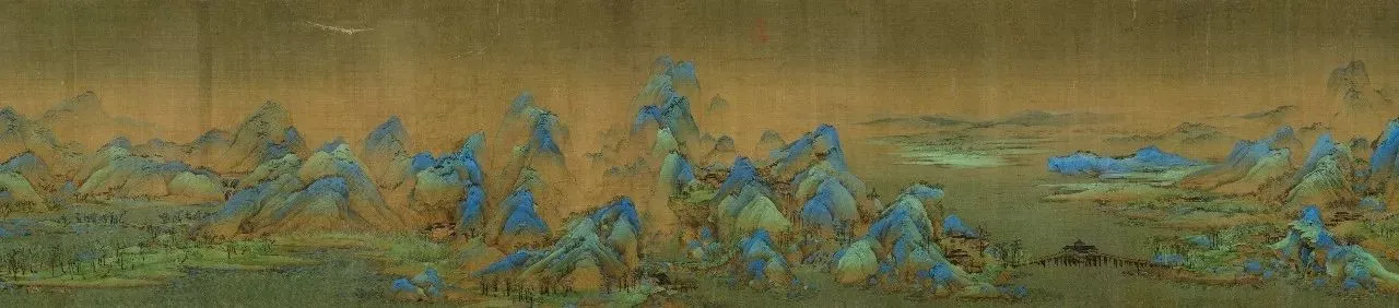 不同于黑白色调的水墨画,青绿山水画因用石青石绿色的矿物质颜料绘成而得名。绚丽的青绿色调交织,描绘着千里江山的锦绣恢弘:山峰层峦叠嶂,奔腾起伏;江水烟波浩渺,平远无尽。山水间有屋舍村落、桥梁渡口、楼阁亭榭,细微处可见众多画中人物在行旅、幽居、捕鱼、观水、游玩。画作古意与创造兼备,实景与想象并融,成为存世青绿山水画中最具代表性作品。