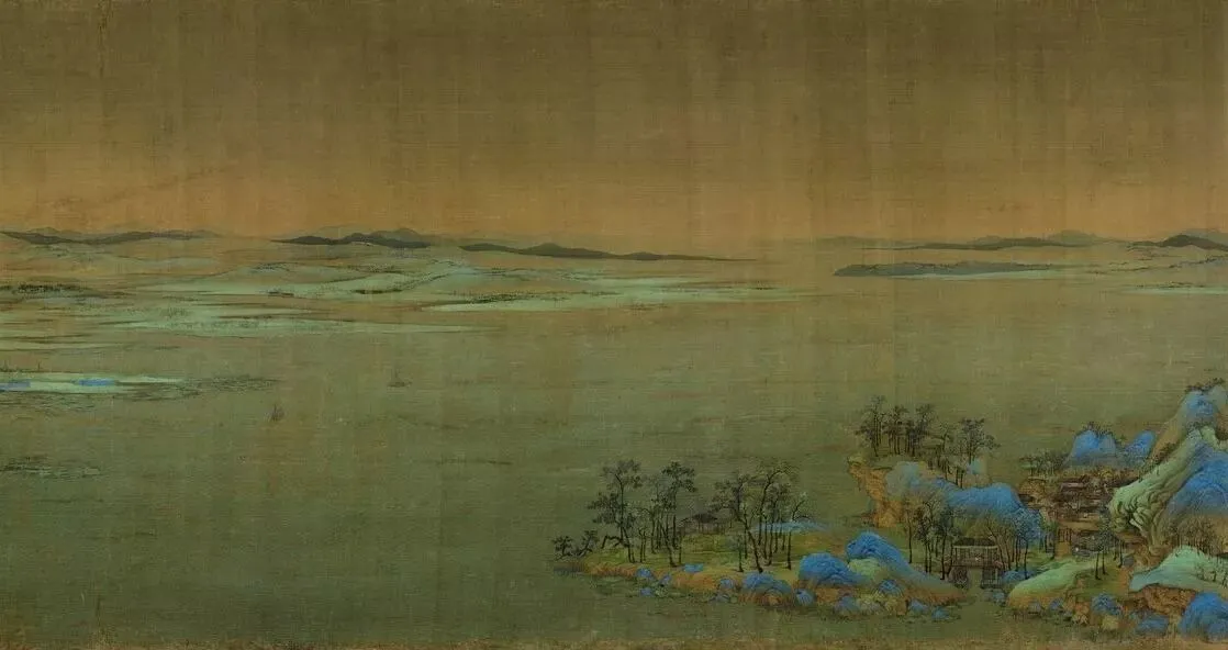 王希孟并非简单地图解孟诗,而是在画中的“太虚”里激昂出“中流见匡阜,势压九江雄”的“峥嵘”气度,也铺写了一片在“天风”下“渺漫平湖”的鄱阳大泽。高山平湖在造型上形成了鲜明对比,显露出画家立足于湖畔仰观“匡阜”的角度,十分切合诗意。