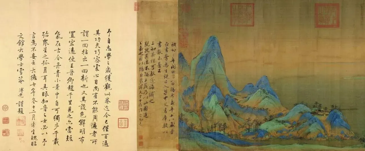 最后一组如同乐章中的尾声,再次振奋起人们的精神,画家用大青大绿涂抹出近处最后的几座山峰,如同打击乐最后敲击出清脆而洪亮的声响,在全卷结束时,回声悠远,令人难忘。