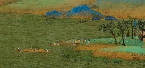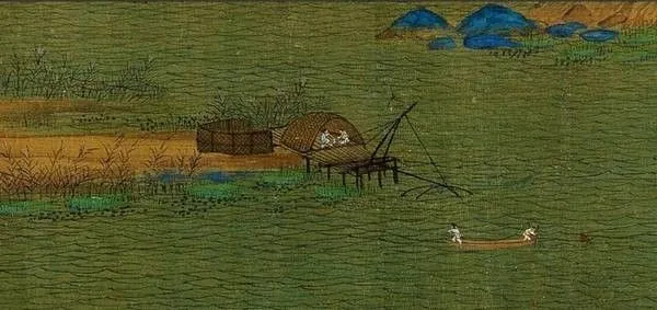 图中的大山大岭屹立在江湖沼泽之畔,在北宋统辖的疆域里,只有江西庐山有此特性。画中展现了开阔的水域,近处水草丛生,远处烟波浩渺,像是长条形的沼泽大湖,远接江海,极似鄱阳湖一带的湿地、沼泽。