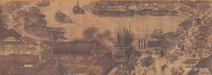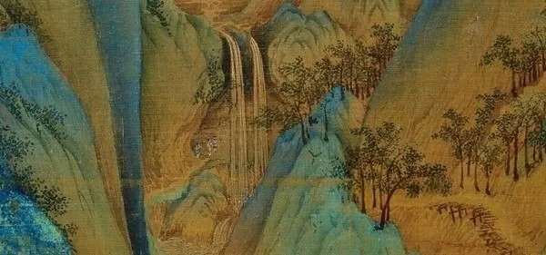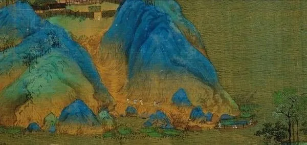 高耸的山峰和鲜亮的青绿色彩,是小提琴不断演奏出的主旋律,丰满厚实;缓坡、沼泽、流水恰似竖琴拨出的慢板,舒缓悠扬;高挂的瀑布和巉岩悬崖就像低音鼓敲击出的节奏,铿锵深沉;建筑、舟船和人物活动如同长笛吹响的快板,轻盈跳跃。画中的各组群山不是简单地循环往复,而是有许多变化,如变换山体造型、增换瀑布和溪流以及建筑群等,细节变化则更多、更丰富,如同乐曲中的“变奏”。不同的节奏与情绪,在不断地交织、变化中融合,一起奏响了北宋宫廷文化的灿烂之声。