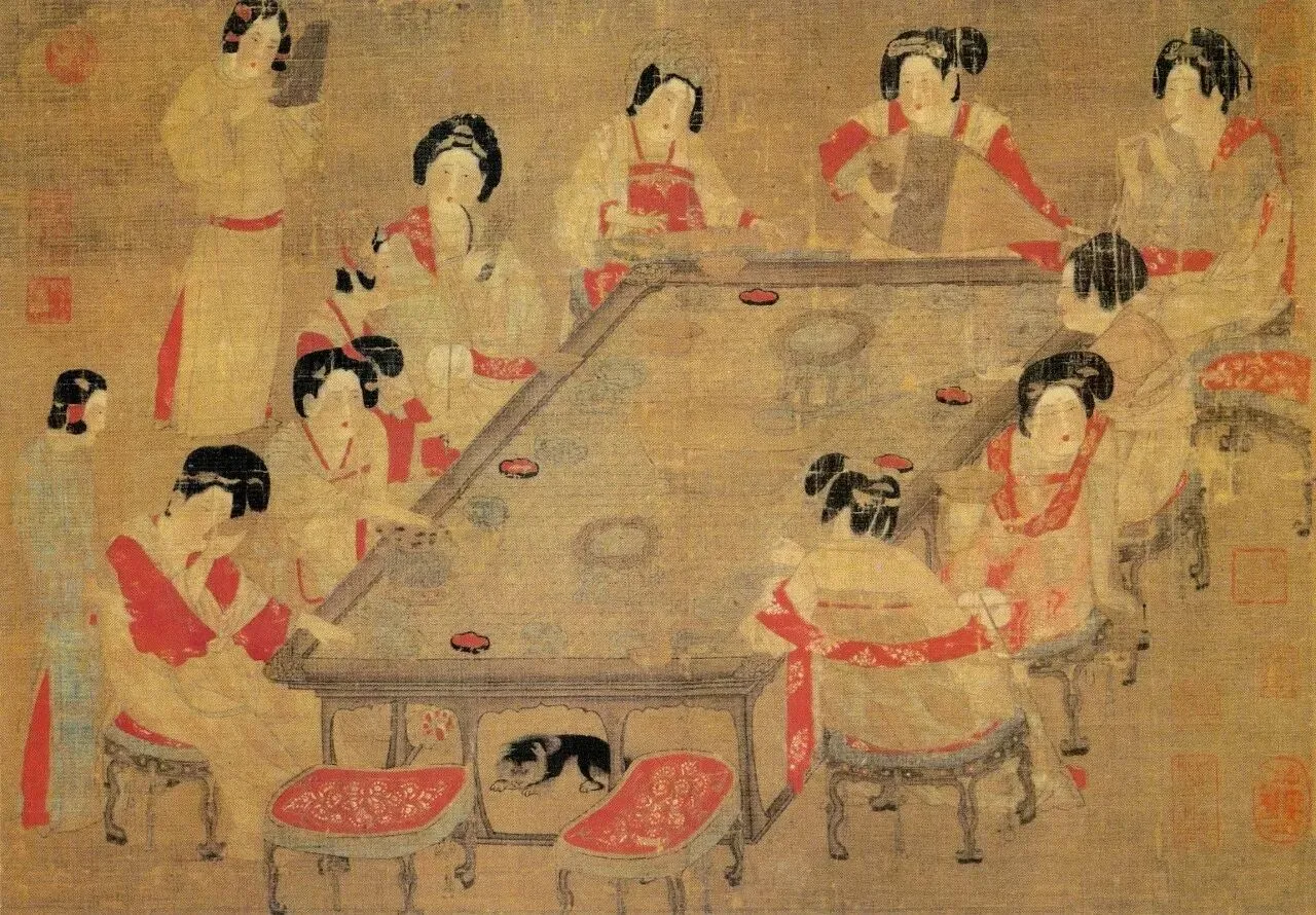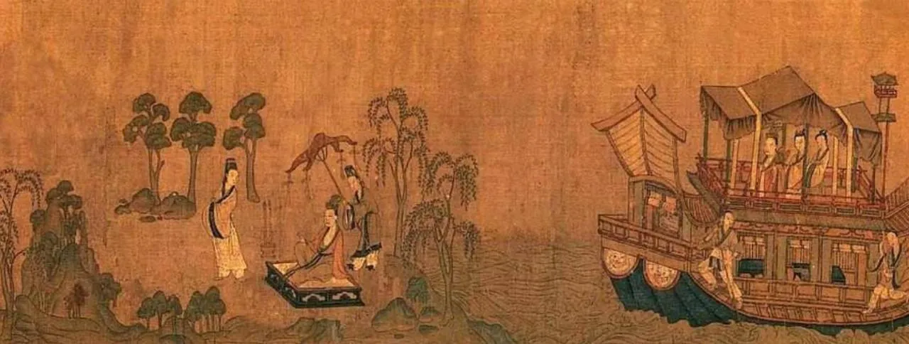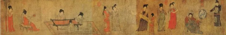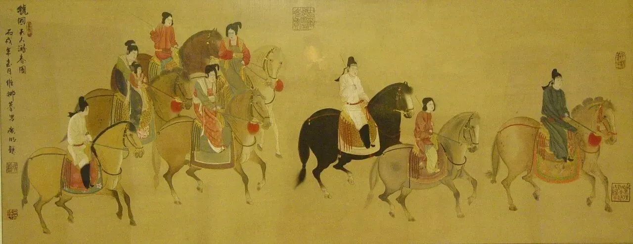 唐代作为封建社会最为辉煌的时代,也是仕女画的繁荣兴盛阶段。“倾国倾城貌,多愁多病身”,唐代仕女画以其端庄华丽,雍容典雅著称,《唐宫仕女图》展示着“回眸一笑百媚生”的唐代美女众生像。 上图依次为张萱的《虢国夫人游春图》、《捣练图》和周昉的《簪花仕女图》、《挥扇仕女图》以及晚唐的《宫乐图》。它们所表现的贵族妇女生活情调,成为唐代仕女画的主要艺术特征。