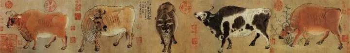 《五牛图》是韩滉最为传神的一幅。5头健硕的老黄牛,在他笔下被人格化了,传达出注重实际、任劳任怨的精神信息。整幅画用笔之细,描写之传神,牛态之可掬,几可呼之欲出。它的珍贵还在于,中国古代留存今世的多为花鸟人物,以牛入画,且如此生动者,《五牛图》堪称孤品。