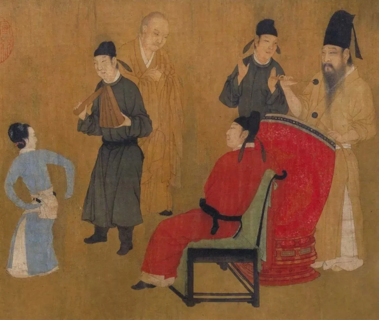 该图如实地再现了南唐大臣韩熙载夜宴宾客的历史情景,细致地描绘了宴会上弹丝吹竹、清歌艳舞、主客揉杂、调笑欢乐的热闹场面,又深入地刻划了主人公超脱不羁、沉郁寡欢的复杂性格。全图共分为五个段落:首段“听乐”,二段“观舞”,三段“暂歇”,四段“清吹”,五段“散宴”,韩氏手持鼓槌送别。(上图为“观舞”)