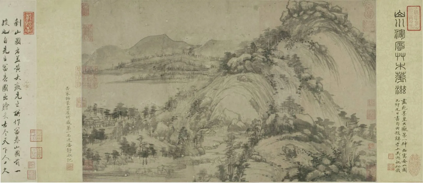 该图由元代画家黄公望在七十二岁时为无用师和尚所绘,耗时长达七年。画面取材于浙江富春江,用墨淡雅,疏密得当,墨色浓淡干湿并用,极富变化。明朝末年传到收藏家吴洪裕手中,他临死前曾下令将此画焚烧殉葬,险被侄子从火中抢救出,但此时画已被烧成一大一小两段。前段较小,称“剩山图”,现藏浙江省博物馆;后段画幅较长,称“无用师卷”,现藏台北故宫博物院。(上图为剩山图局部)
