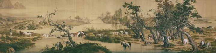 此图共绘有100匹骏马,姿势各异,或立、或奔、或跪、或卧,可谓曲尽骏马之态。郎世宁是意大利人,使用的是中国软笔,却按西画的透视和光感等技巧,把花卉的形态和神态表现出来,体现了高超的写生功夫和创意能力,画得相当精细,立体感极强。虽然用的不是油画用的油彩,却栩栩如生,逼真到让人忍不住触手去摸。