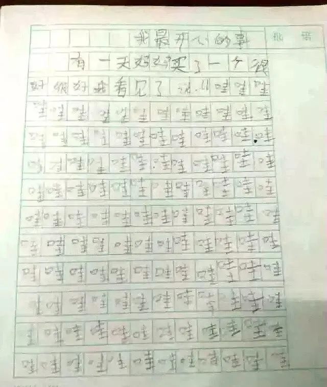 浙江萧山一位老师发帖说:有一个孩子,干了我们小时候都不敢干的事情。为了作文凑字数,他勇敢地用了两页的「哇」字来填补空白,被老师罚读自己的作文……是什么好东西让你哇了两页?
