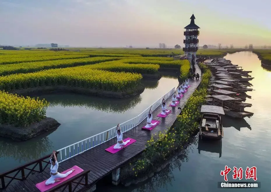 当日,几名瑜伽爱好者在“垛田”花海中展示瑜伽技艺,吸引不少游客驻足观看。她们优美的身姿在金黃色油菜花衬托下,美轮美奂,呈现出一幅天人合一的美丽景象。