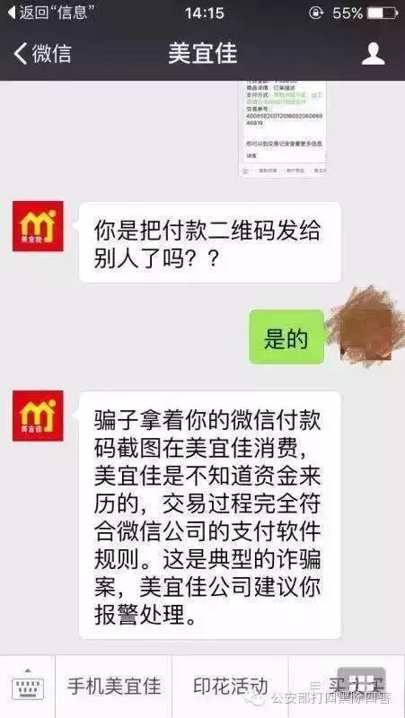 杨女士随即加了这个公司的公众号进行询问,对方告知是骗子拿着微信付款码截图在美宜佳消费,是典型的诈骗案,建议杨女士赶紧报警处理。