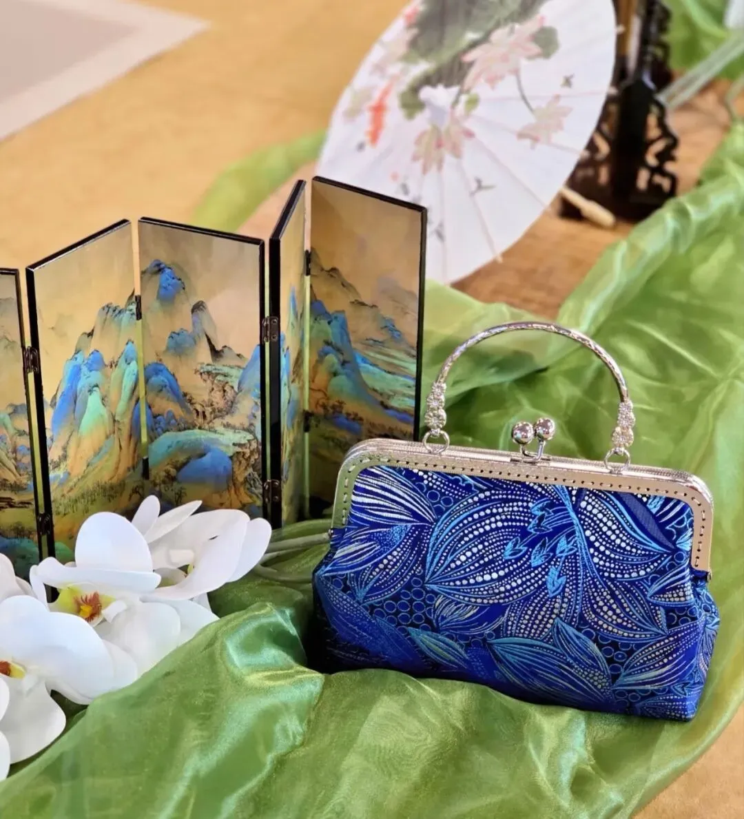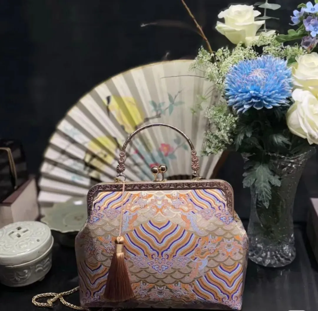 以 “锦绣之冠” 宋锦为底,缀珍珠并以针线结合织锦与珠宝工艺。针脚含匠心,珍珠增华贵,尽显东方美学精致典雅。