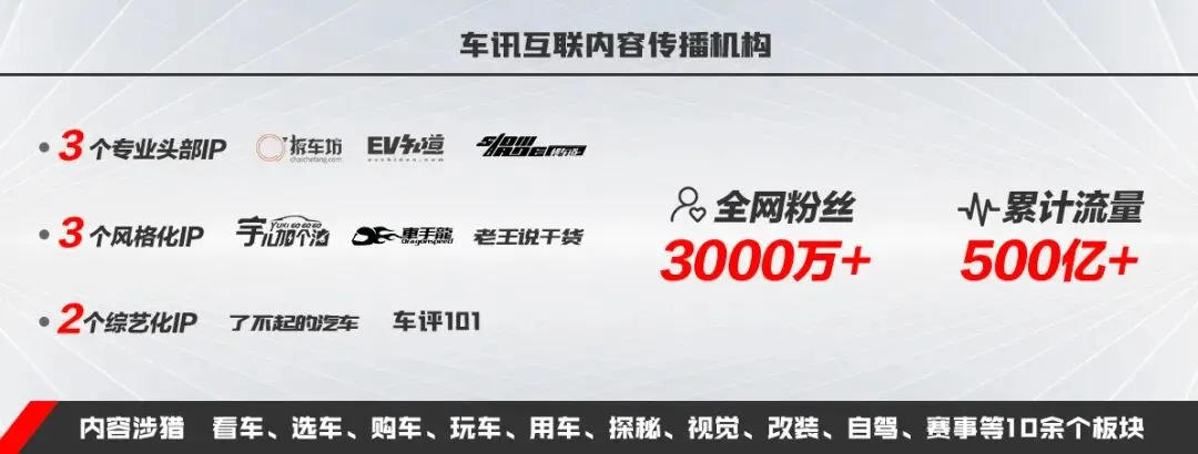 截止目前,作为首个汽车媒体的MCN机构--车讯互联,成功打造了布局全域的、差异化、触达不同标签用户的8大IP,包括《拆车坊》、《慢车道》、《EV知道》3大专业头部IP;《宇儿加个油》、《车手龙》、《老王说干货》3大风格化IP;以及《了不起的汽车》、《车评101》2大综艺化IP,内容涉猎看车、选车、购车、玩车、用车、探秘、视觉、改装、自驾、赛事等10余个板块, 全网粉丝超3000万,累计流量超500亿