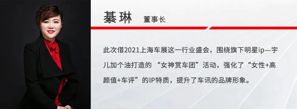 车讯互联董事长綦琳则表示,此次借2021上海车展这一行业盛会,围绕旗下明星ip—宇儿加个油打造的 “女神赏车团”活动,强化了女性+高颜值+车评的IP特质,提升了车讯的品牌形象。