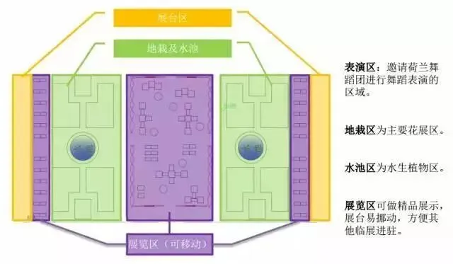 活动园区分为A、B、C三馆以及室外展区。展馆设计与荷兰CTBC国际园艺公司达成合作,引进荷兰最先进的庭院、园艺、花艺布展技术,邀请荷兰著名大师设计、布展,打造媲美荷兰最高水平的花卉会展。