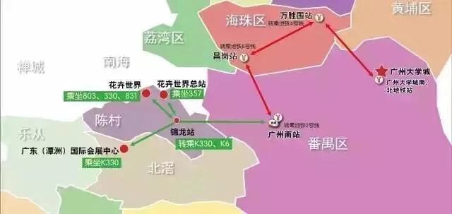1、花卉世界(803、330、831)→锦龙站(转乘K6、K330)→广州南站(转乘地铁2号线)→昌岗(转乘地铁8号线)→万胜围(转乘地铁4号线)→广州大学城