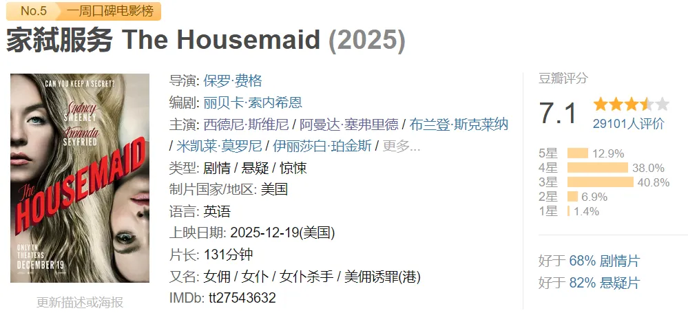说到影视剧作品中的“疯批女主”,这类作品往往以反抗和复仇为主题,展现女性坚韧不拔的毅力和杀伐果断的勇气,对男权社会的痛点进行重重一击,也是吸引人观看的焦点。最近刚出的《家弑服务》就是这种类型,悉尼妹饰演一位坐了十年牢,刚保释出来找工作的保姆,高中时期目睹室友被同班男生xing侵,义愤填膺地她将男生暴击致死。阿曼达饰演一位家庭主妇,有一个女儿,男主人则是一位容貌事业口碑都完美无缺的万人迷,是邻里口中的好好先生,可在婚姻和男女关系中,却是一位心理变态的顶级掠食者,对他的妻子和新近入职的家庭保姆展开了一系列PUA操作,最后被悉尼妹和阿曼达两位女主联合反杀,最近口碑很不错的电影。