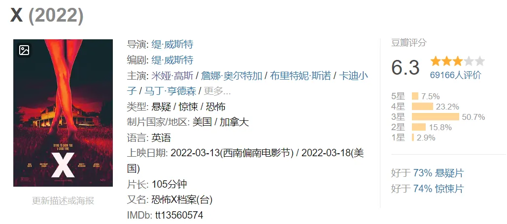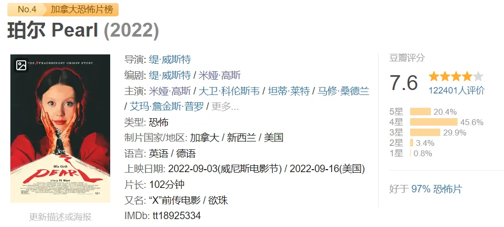 说到疯批女主,还有一位不得不提,那就是米娅·高斯,她那近乎癫狂式的表演,在恐怖片中的地位绝对值得称赞,尤其是《X》和《珀尔》,杀伐果断,让人猝不及防。