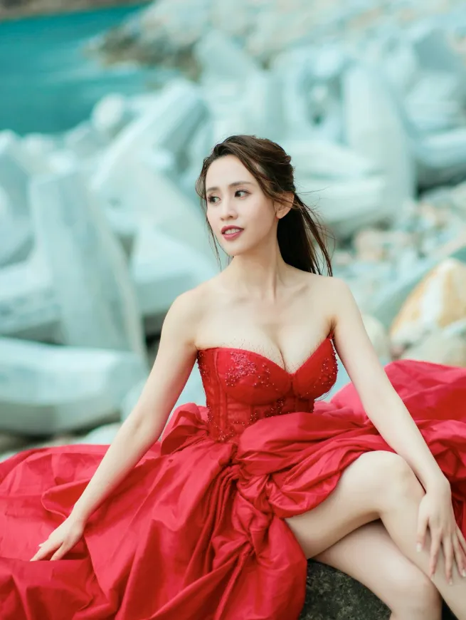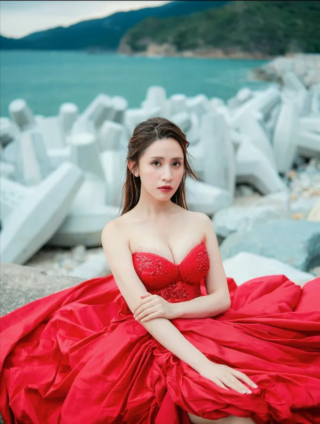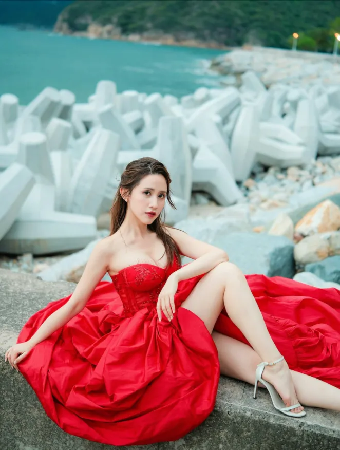 从照片可见,梁菁琳身穿一袭鲜红色低胸晚装长裙,特意前往海边取景。鲜艳的火红长裙与雪白肌肤形成强烈视觉对比,尽显妩媚动人一面。