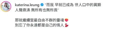 梁菁琳在配文中,引用了内地歌手周深的作品《不群》歌词写道:“而我,早已成为,世人口中的异类,人声鼎沸,无所有也无所畏”,原来她也是周深的粉丝,早前观看了周深在香港的演唱会!