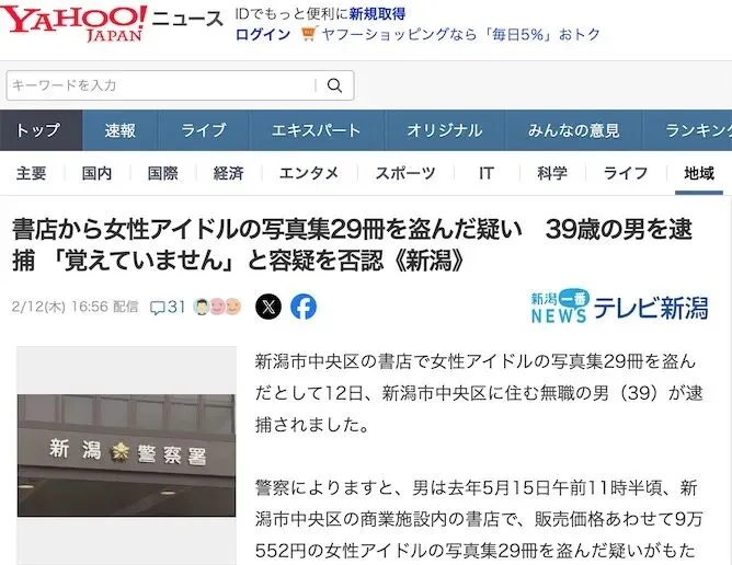 据日本“新潟电视台”2月12日报道,12日,一名居住在日本新潟市中央区的39岁无业男子因涉嫌从该市中央区一家书店盗窃29本女偶像写真集而被捕。