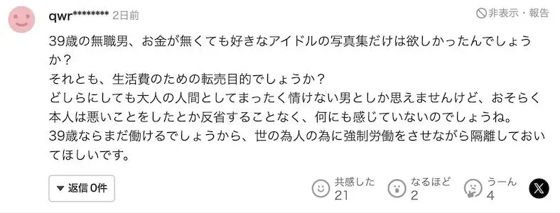 这位39岁的失业男子,身无分文却想要他最喜欢的偶像的写真集?还是说他打算转手倒卖来维持生计?无论如何,作为成年人,他看起来真是个可悲的男人,而且估计他对自己的所作所为毫无悔意。39岁还能工作的吧,所以为了社会和人民,我希望他被隔离起来,被迫从事体力劳动。