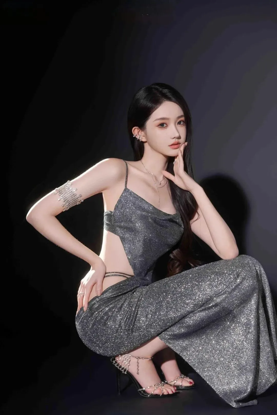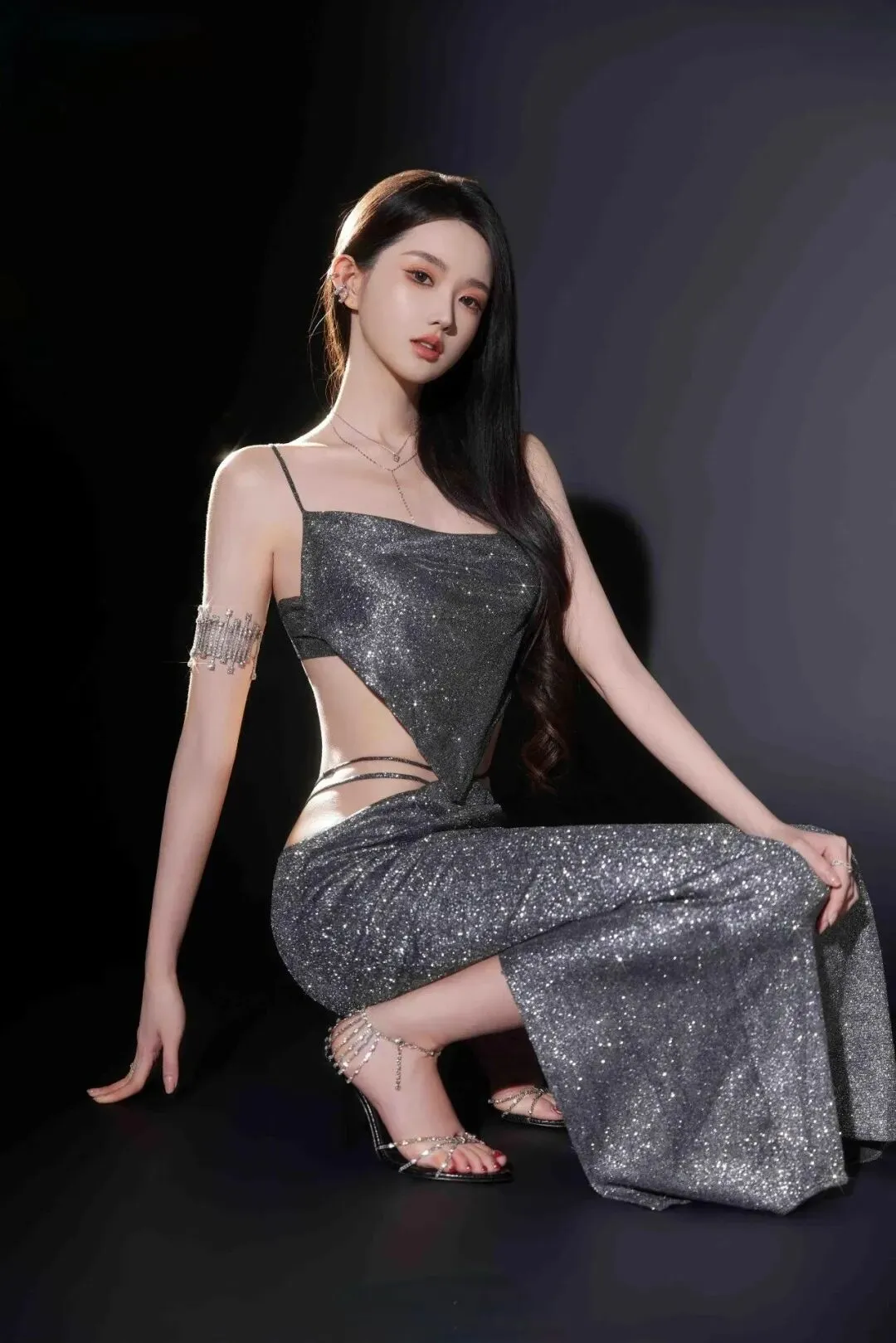 让模特单膝轻蹲,一只手自然搭在膝盖上,另一只手去整理脚踝上的水钻链条。侧逆光从身后打过来,刚好把她的肩线和手臂边缘勾出一层亮边,闪片裙在阴影里泛着细碎的光,像刚从派对上悄悄退到角落整理裙摆的样子,松弛又带点小性感。