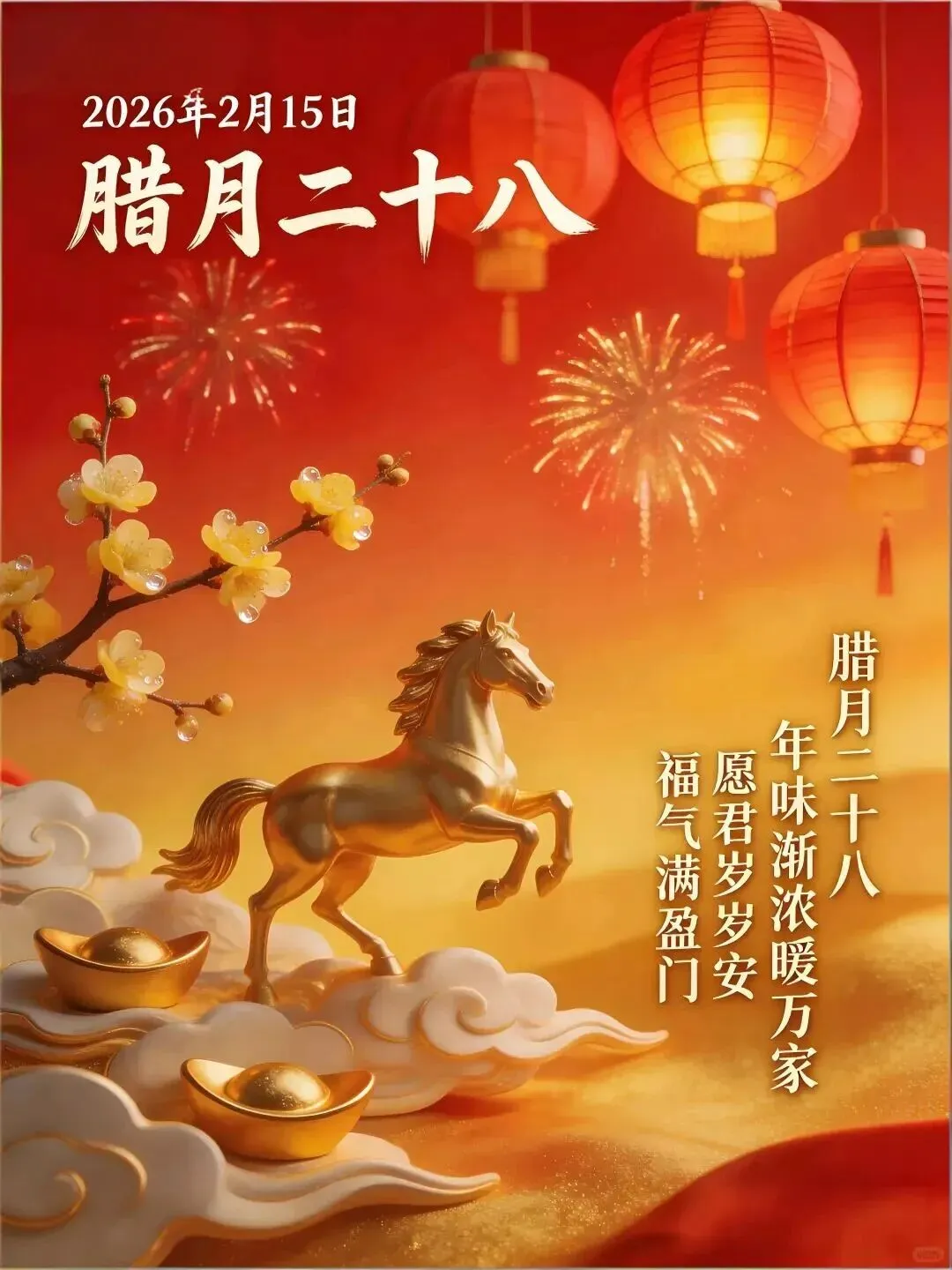 今日农历腊月二十八,年味渐浓,春意待发,明天就是除夕了,愿你愿你揉碎旧岁的烦恼,捏出新年的欢喜,愿你在忙碌中保重身体,笑迎新春,岁岁平安喜乐,早安!